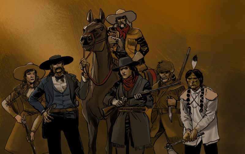 Character art from SIOUX FALLS, a western graphic novel project. This is an evil version of a Buffalo Bill traveling show group.